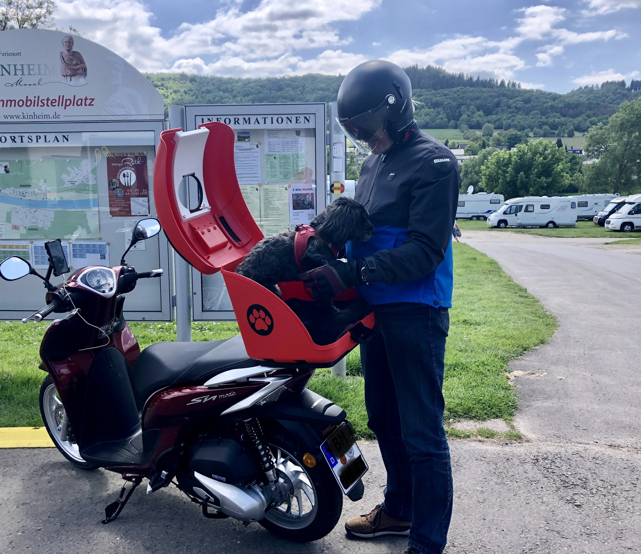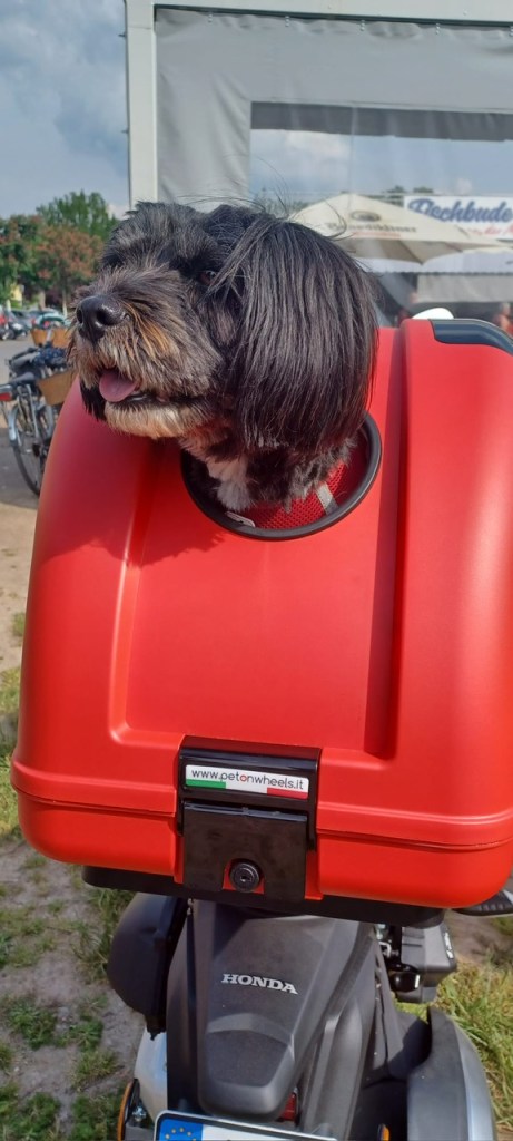 Mimmi‘s erste längere Tour auf dem Motorroller in ihrer neuen Ped-Box aus Italien. Es ging 20 Kilometer von Kinheim nach Wittlich und zurück. Sie hat genug Bewegunsspielraum und blieb während der Fahrt völlig tiefenentspannt liegen. Wir waren zunächst etwas skeptisch und sind nun erleichtert, Mimmi auf unseren Roller Touren problemlos mitnehmen zu können