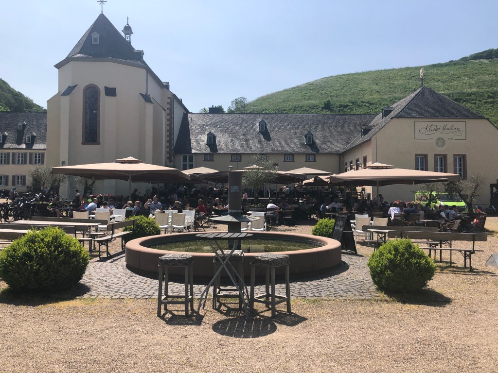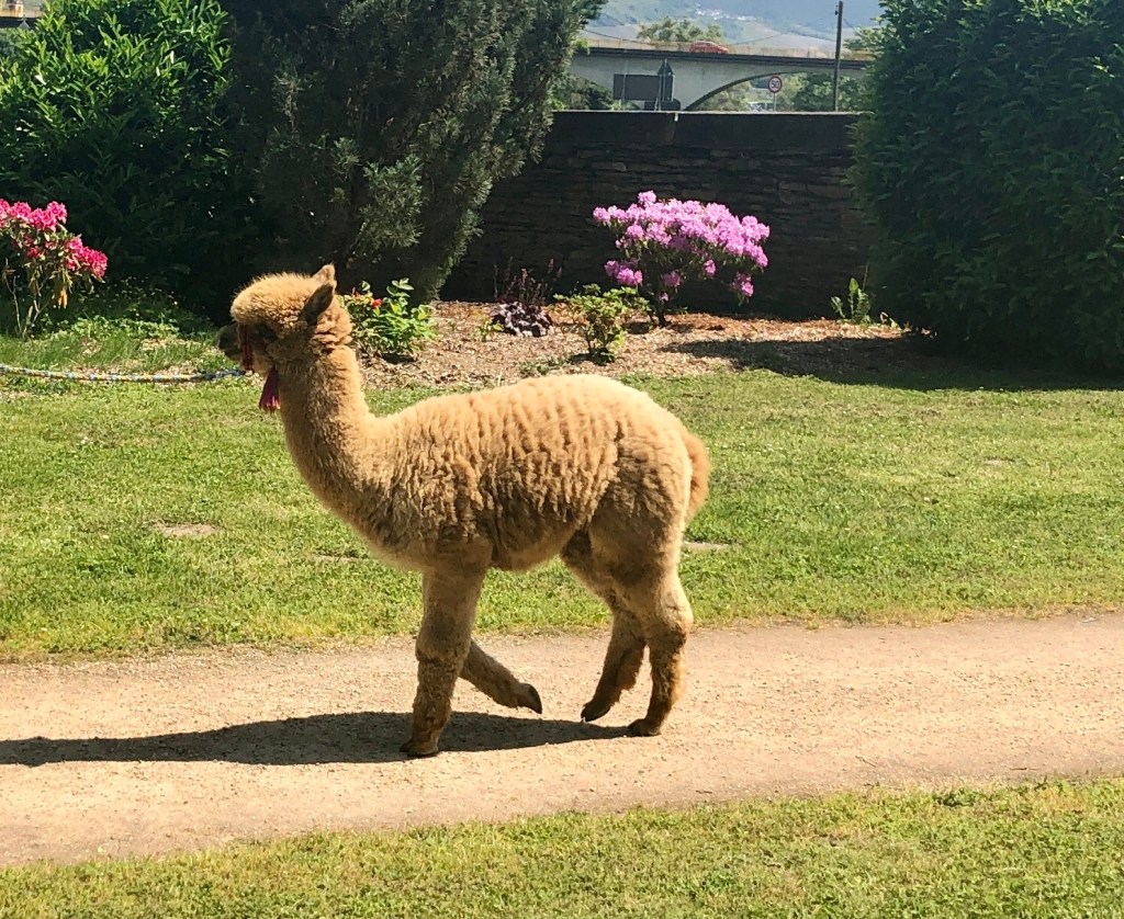 27. Mai, Samstag. Ausfahrt ins Kloster Machern. Ein ehemaliges Kloster der Zisterzienserinnen am linken Moselufer in der Nähe von Bernkastel-Kues. Im 13. Jahrhundert gegründet, 1802 Säkularisiert und heute ein Ausflugsziel mit Klosterbrauerei und Brauhaus, Weinkeller und einem Museum in das man, selten genug, Hunde mitnehmen darf. Auf der Terrasse tummelten sich heute jede MengePfingstausflügler und im Klostergarten entzückende Alpakas