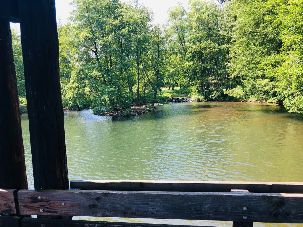 Der See wird vom Holzbach gespeist, ein überdachter Wandelgang führt auf einer Seite entlang des Ufers