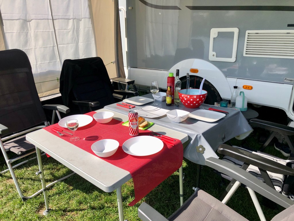 Naja, es ist zwar ein Gasgrill ohne Glut und Funken, aber es hat herrlich geschmeckt, bei interessanten Gesprächen mit unseren netten Stellplatz-Nachbarn und das Ganze gewürzt mit einigen berauschenden Getränken