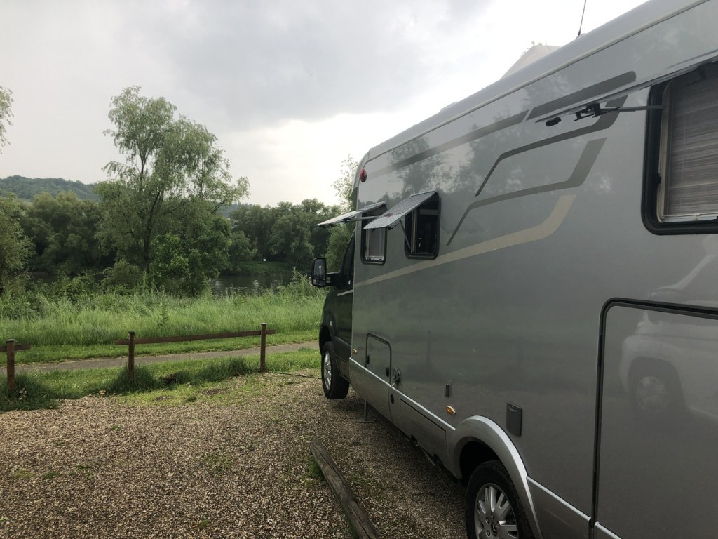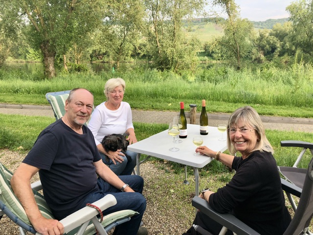 18. Mai, Donnerstag. Wir sind wieder unterwegs und stehen seit zwei Tagen auf dem Stellplatz in Kinheim an der Mosel N 49° 58’ 18“ E 7° 3‘ 28“. 10€ pro Nacht, Strom 4€ für 24 Stunden. Liebenswerte Freunde haben uns erwartet und sogar den Rasen auf der Stellfläche vor unserer Ankunft gemäht.