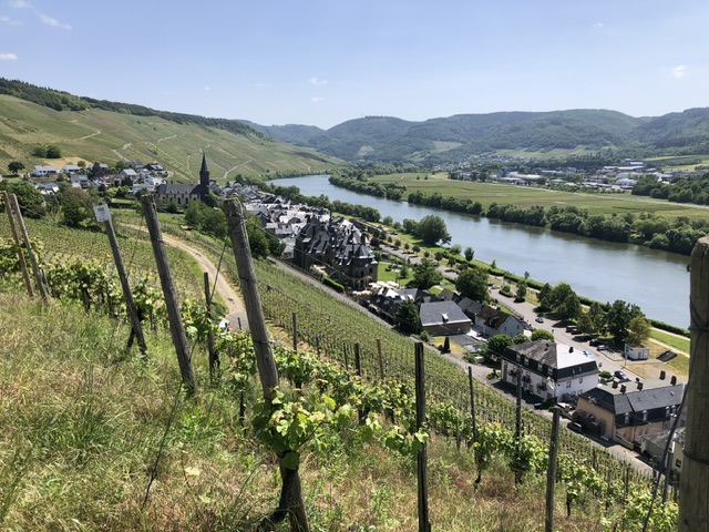 25. Mai, Donnerstag. Spaziergang durch den Weinort Lieser, an der Mündung der aus der Hocheifel entsprungenen Lieser in die Mosel. Über weite Strecken parallel zur Lieser verläuft auf einer stillgelegten Bahntrasse der Maare-Mosel-Radweg