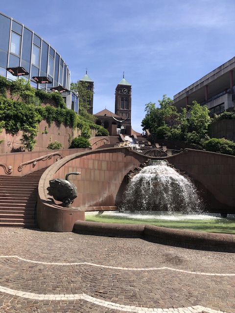 Inmitten der Fußgängerzone, die Schlosstreppen und der Schlossbrunnen mit einem imposanten Wasserlauf
