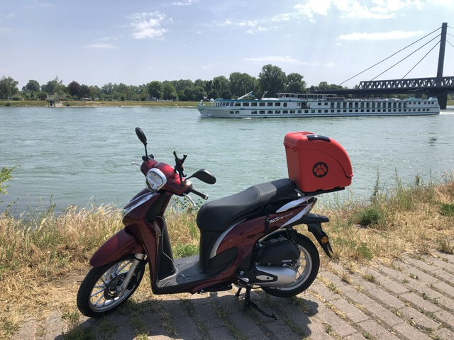 Motorroller Ausflug nach Wörth am Rhein. Kaum zu glauben, dass 3 Wesen (zwei 🧔👩🦰und ein 🐶 ) auf diesem kleinen Gefährt transportiert werden können, aber es klappt ausgezeichnet
