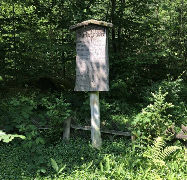Wir haben die tief im Wald versteckten Turkogräber gefunden. 1870 kämpften hier 7.000 Franzosen gegen 50.000 Preußen und Bayern einen aussichtslosen Kampf. Auf französischer Seite kämpften die Turkos, Kolonialsoldaten aus Afrika. Hier liegen vier dieser afrikanischen, aus Oran, dem heutigen Algerien stammenden Kämpfer