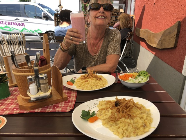 Am frühen Abend fuhren wir mit dem Motorroller fünf Kilometer bis zu der Käserei Vogler. Neben der Möglichkeit einer Käsereiführung gibt es ein Käsemuseum und natürlich eine Käsetheke. Für uns gab es Himbeerbuttermilch und Käsespätzle