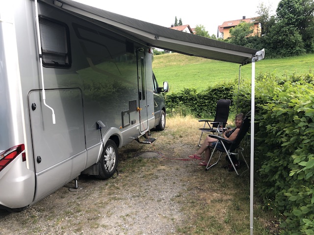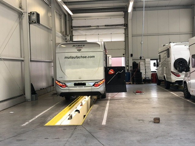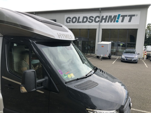 19. Juni, Montag. Wir stehen seit 10:00 Uhr bei der Firma Goldschmitt in Leutkirch und warten auf den Reparaturtermin gegen 15:00 Uhr. Die vordere Hubstütze auf der Fahrerseite macht einen höllischen Lärm, wenn sich das Fahrzeug auf unebenen Gelände ausrichtet