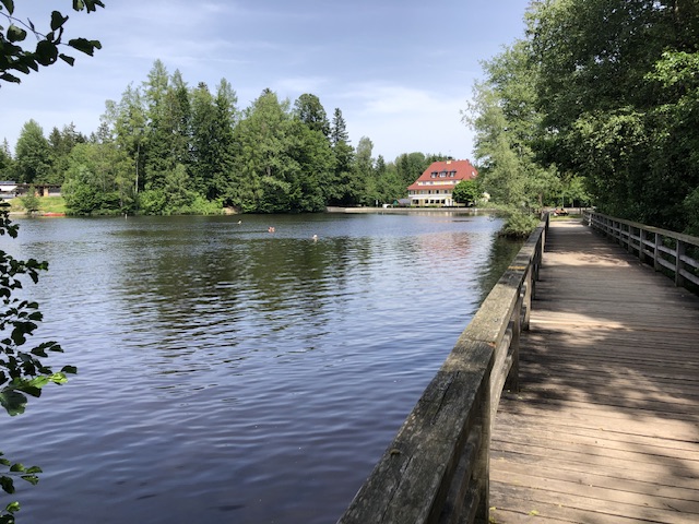 Der zu Fuß in fünf Minuten vom Stellplatz erreichbare Waldsee lädt zu Baden und zum Verweilen auf einer der vielen Bänke oder der großen Liegewiese ein