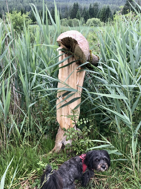 Mimmi ist baff, sie schaute und beschnupperte erstaunt das Werk eines Bibers am Ufer der Loisach