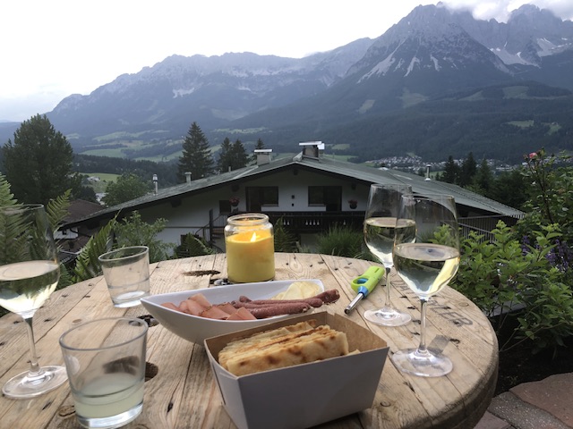 Wir sitzen im Garten einer lieben Freundin hinter ihrem Haus und genießen bei einem guten Glas Wein den Blick auf den Wilden Kaiser