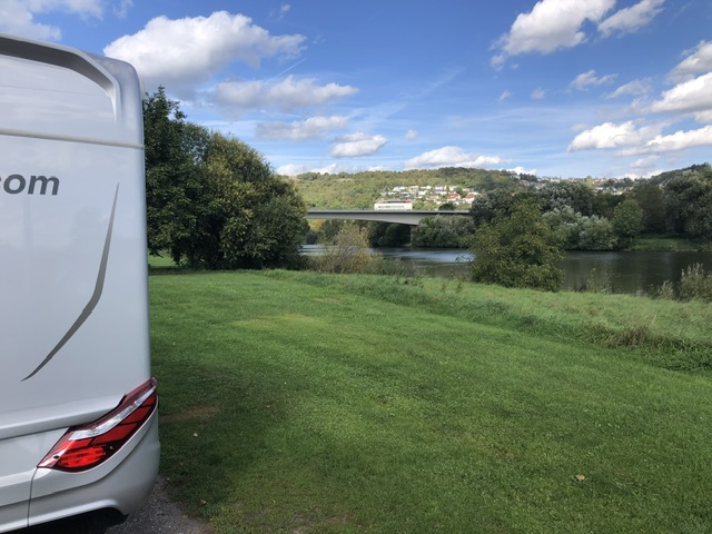 Wir stehen unmittelbar am Neckar in Obrigheim. Ein kleiner Stellplatz ohne V/E und ohne Strom, dafür aber gebührenfrei. Diesen Platz fahren wir auf unseren Touren in den Süden seit Jahren an N 49° 21‘ 1“ E 9° 5‘ 59“