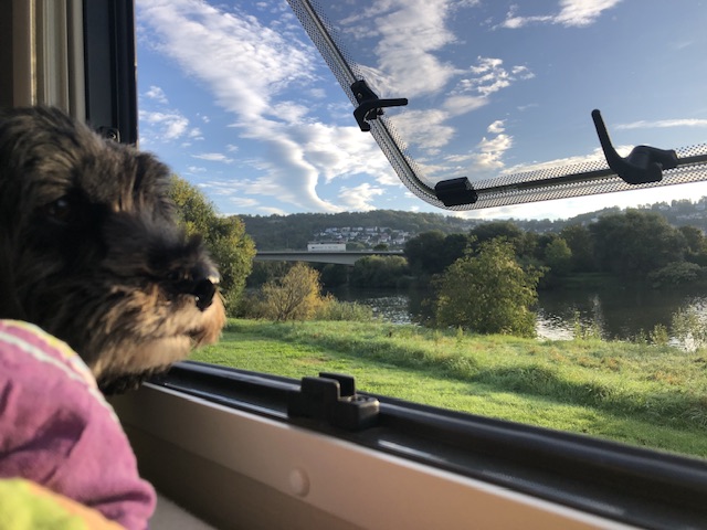 20. September, Mittwoch. Noch etwas schläfrig schaut Mimmi am frühen Morgen auf den Neckar, in der Hoffnung irgendetwas zu entdecken, das sie verbellen könnte