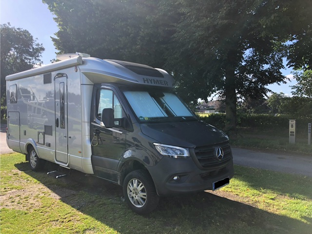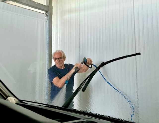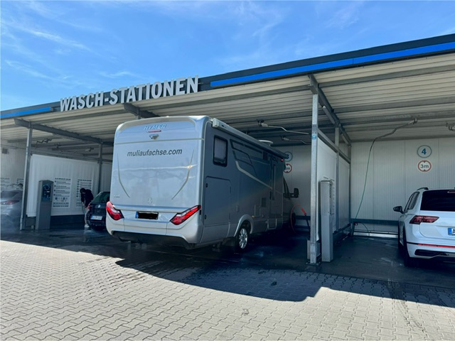 9. Juli, Dienstag. Wie üblich fahren wir diese Waschanlage an, bevor wir nach einer Tour wieder zu Hause eintreffen. Die Anlage ist zwar hoch genug, aber in der Tiefe passen natürlich nur PKW’ s hinein. Also wasche ich zuerst die vordere Hälfte, wende das Fahrzeug und wasche dann die hintere Hälfte