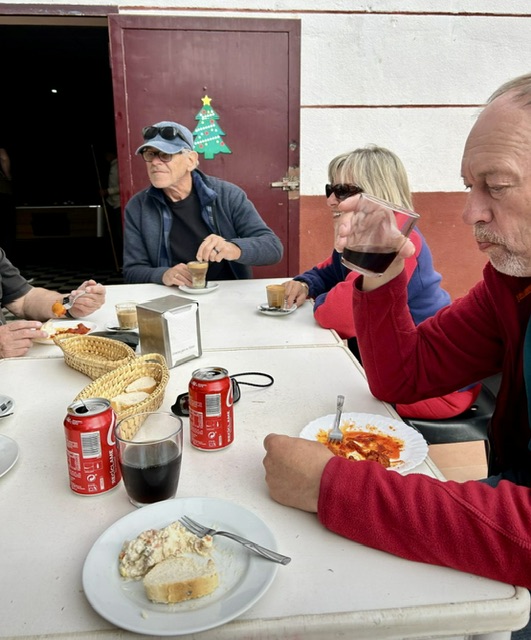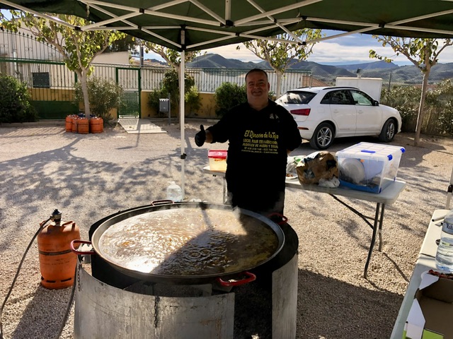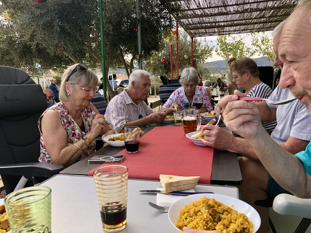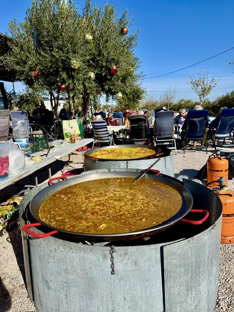7. Dezember, Samstag. Das große Schlemmen kann gleich beginnen. Die Platz Chefin Maria spendiert mal wieder Paella, dazu einen süffigen roten Wein und als Abschluss Mandarinen und süßes Naschwerk. Der Koch gibt sein Bestes, die Paella so schmackhaft wie möglich zuzubereiten