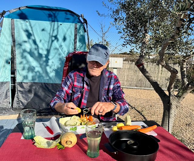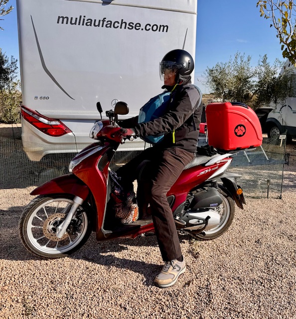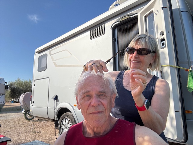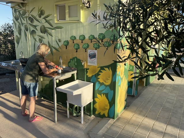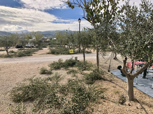 Auf dem Stellplatz wurden heute die Olivenbäume beschnitten, die die einzelnen Parzellen begrenzen. Nun können wir zwar mehr sehen, haben dafür aber weniger Schatten. Man kann eben nicht alles haben 😊