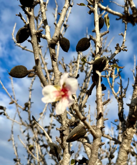 11. Dezember, Mittwoch. Eine frühe erste Blüte am Mandelbaum, während die ungeernteten vorjährigen Mandeln langsam faulen