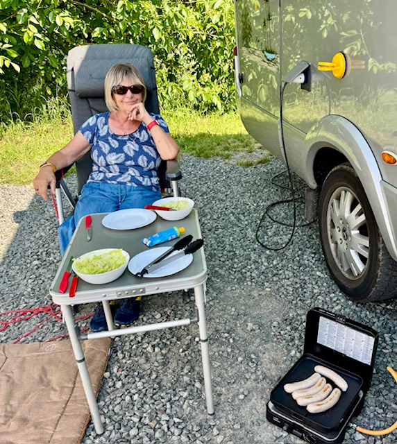 Zum Abend, bei 30 Grad Celsius gab es Thüringer Bratwurst und dazu einen erfrischenden Salat. Zumindest die Vorfreude auf die einfache Mahlzeit sieht man Uschi an. Ob‘s ihr schmeckt?