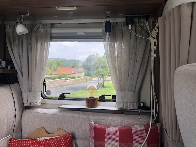 10. Juni, Dienstag. Um 9:00 Uhr hatten wir einen Termin bei den „Maß-Schneidern“ in Kelberg, in der Nähe unseres Übernachtungsplatzes. Wir haben Muli neue Gardinen spendiert und neue Überzüge für die Armlehnen. Gegen Mittag war die Arbeit der sehr netten Schneiderinnen getan und wir sind wenige Kilometer weiter zu guten Freunden gefahren. Dort haben wir einen sehr schönen Tag bei guten Gesprächen und ebenso guten Essen verbracht. Morgen werden wir noch zusammen frühstücken, bevor wir unseren Trip fortsetzen