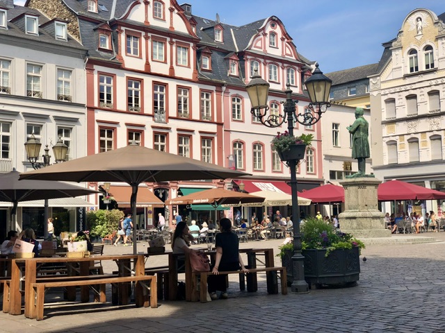 Spaziergang durch Koblenz und über den Jesuitenplatz im Herzen der Altstadt. Das Glockenspiel lässt stündlich unterschiedliche Melodien erklingen