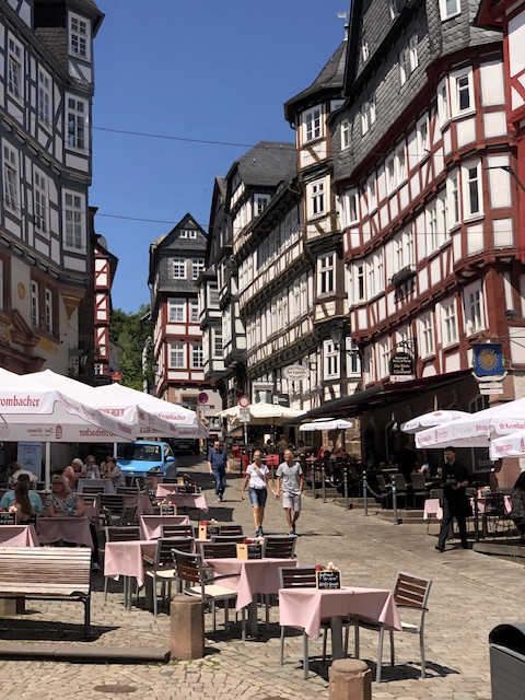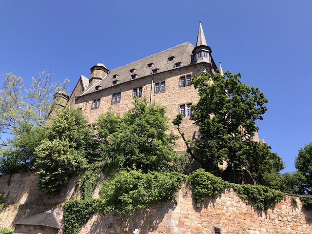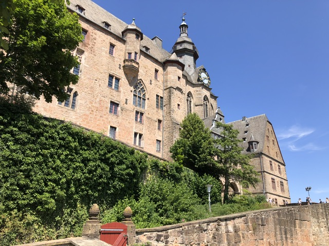 20. Juni, Freitag. Am vorletzten Tag unserer kurzen Reise zog es uns in die Universitätsstadt Marburg. Unser Stellplatz mit V/E und Stromanschluss, keine Grauwasserentsorgung, liegt in der Unterstadt, etwa 15 Gehminuten von der historischen Altstadt entfernt. Die Platzgebühr beträgt 12 €