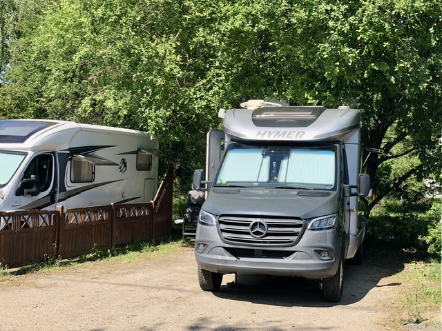Wir stehen 15 Minuten fußläufig von der Altstadt entfernt auf einem Stellplatz mit 7 engen Plätzen, ohne V/E für 12 €.