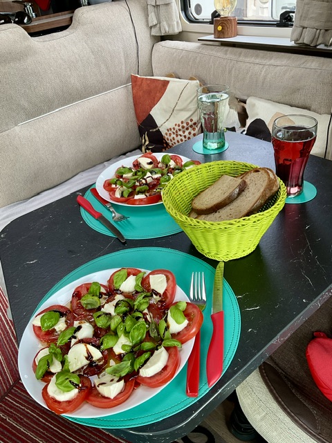 15. Juni, Sonntag. Die Nacht war kurz nach zwei Uhr zu Ende, als ein heftiger Regenschauer, mit Hagel verbunden, auf das Wohnmobildach trommelte. Auch der Tag war immer wieder von kurzen Regenschauern durchbrochen. Erfrischend waren die gut 13 Grad niedrigeren Temperaturen gegenüber den letzten beiden Tagen. Am Abend gab es Tomaten Mozzarella. Auf jedwede Art von Moselwein haben wir heute verzichtet