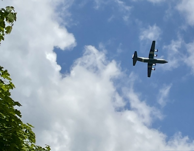 oder ein Transportflugzeug Lockheed C-130 Hercules, das im Tiefflug uns mit einer kräftigen Lärmwolke überzieht