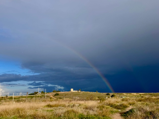 29. Dezember, Montag. In dieses Unwetter, das auch von dem schönen Regenbogen nicht gemildert wird, bin ich heute mit dem Motorroller hinein geraten. Innerhalb weniger Sekunden regnete es so stark, dass ich anhalten mußte, weil ich durch die Helmscheibe nichts mehr sehen konnte. Im 50 Kilometer entfernten Murcia hat in der vergangenen Nacht ein Tornado erhebliche Schäden angerichtet. Zum Glück sollen die kommenden beiden Tage sonnig und wieder wärmer werden