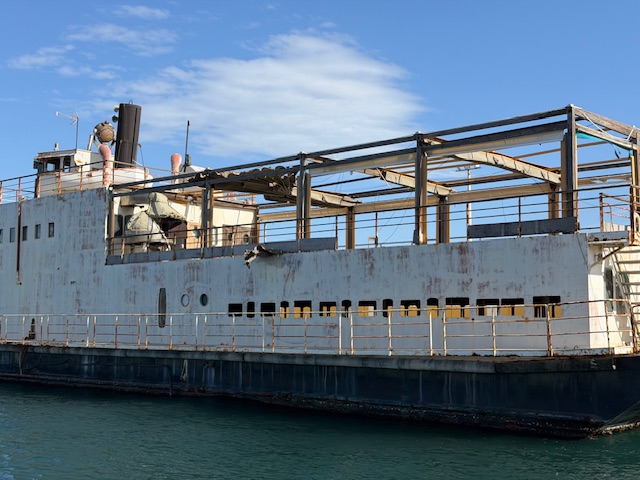 Ein alter, dem Rost und dem Untergang geweihter Seelenverkäufer liegt hier am Pier, der seine Zeit dem äußeren Anschein nach schon lange hinter sich hat