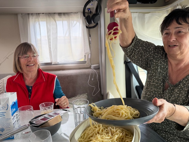 7. Februar, Samstag. Ein sonniger Tag, allerdings begann es am Nachmittag wieder heftig zu stürmen. Der Wind wuchs sich in Böen zur Windstärke 8 aus. Unsere Nachbarn Tina und Dieter haben uns zu Spaghetti Bolognese eingeladen, nachdem Dieter viele Stunden lang eine herrlich schmeckende Bolognese in der Pfanne schmoren ließ. Ein launiger Abend, gewürzt mit diversen Getränken und lustigen Geschichten umrahmte das gemeinsame Essen