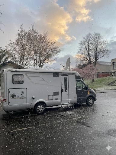 31. März, Dienstag. Hallo Deutschland! 🇩🇪, wir sind wieder da. Die Ankunft war ziemlich erfrischend, wir haben die warmen spanischen Wintermonate nun gegen die deutsche Kühlschrank-Temperatur getauscht. Uschi und ich üben jetzt wieder fleißig das „Mütze-auf-Schal-um-Ritual“, während wir sehnsüchtig an die warmen Tapas-Abende zurückdenken. Aber hey, zumindest gibt’s hier Weißwürste und Brezel. Wir stehen im Schneegrießel auf dem Stellplatz in Lottstätten. V/E und Strom vorhanden, 15 € pro 24 Stunden. Auch für Mobile mit Hänger geeignet.