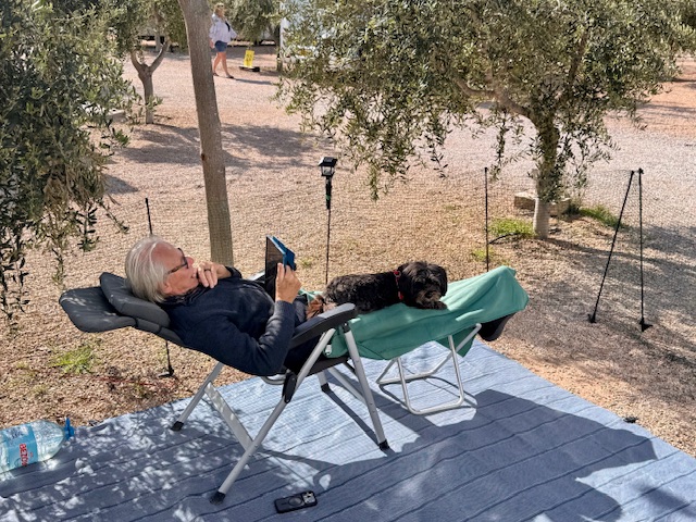 7. März, Samstag. Hier liege ich nun und nutze die heilende Kraft von frischer Luft und Entspannung unter dem Halbschatten der Olivenbäume. Auch Mimmi als „Therapie-Hund“ spendet wohlige Wärme und trägt zu meiner Genesung bei