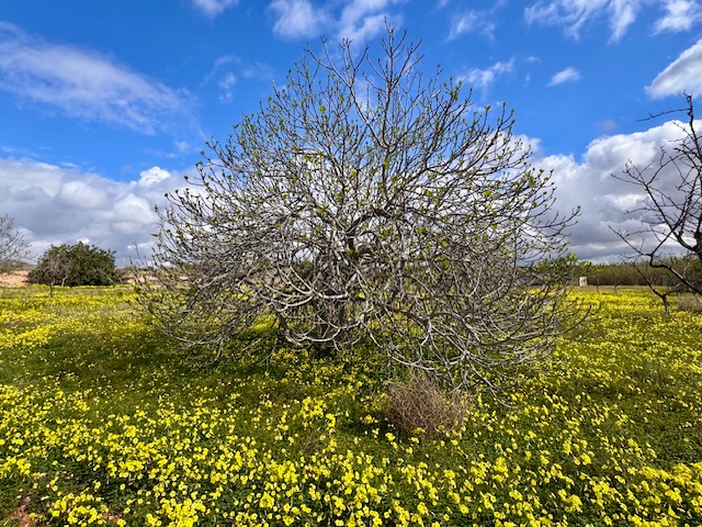 Spaziergang mit Mimmi. Inmitten einer farbenprächtigen Blumenwiese unter blauem Himmel steht ein Feigenbaum, der gerade beginnt, seine ersten zarten Blätter zu entwickeln. Das Bild strahlt eine wunderbare Ruhe aus und der Duft von Frühling liegt in der Luft und