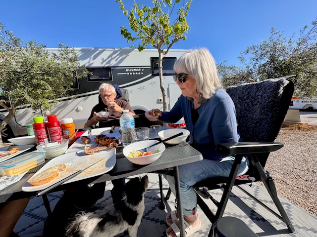 Nachdem alles verstaut, der Roller endlich im dunklen Schlund der Heckgarage verschwunden ist und die Spanngurte angelegt sind, folgt die Belohnung für die ganze Plackerei. Erik hat ein letztes Mal den Grill angeheizt und wir genießen den Ausklang des Tages bei kühlen Getränken und einem schmackhaften Essen
