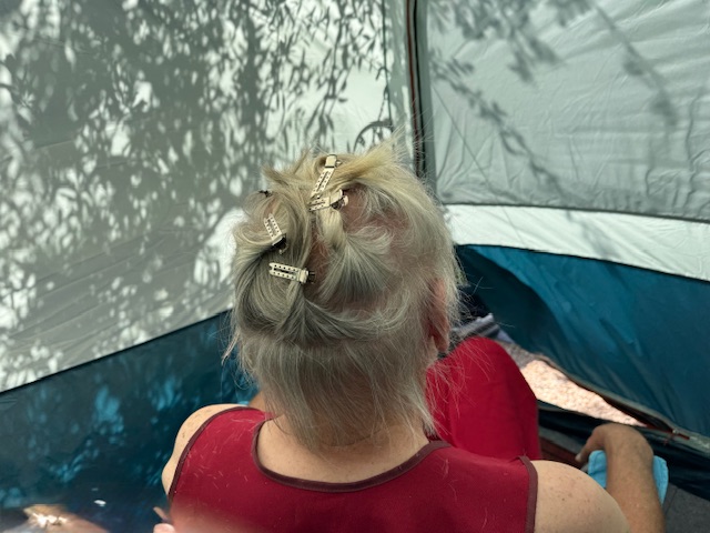 Auch das gehört zum Campen. Draußen pfeift der Wind gegen das Küchenzelt, drinnen herrscht eine Konzentration, die man sonst nur aus OP-Sälen kennt. Ich sitze auf einem wackeligen Campingstuhl, während Uschi mit der Schere um mich herumtänzelt wie eine Raubkatze um ihre Beute. Ich wage kaum zu atmen. Jedes Mal, wenn das Zelt von einer Windböe heftig flattert, zuckt Uschis Hand ein wenig und mein Herzschlag setzt kurz aus. Aber ohne Blutvergießen habe ich alles überstanden und ein Blick in den Spiegel zeigt, Uschi hat es bestens hinbekommen
