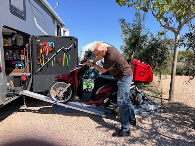 16. März, Montag. Unsere Zeit im Los Olivos Camperpark läuft langsam ab. Da wir uns am Mittwoch in kleinen Etappen auf den Weg nach Deutschland machen werden, gilt es das Küchenzelt auszuräumen und alle Geräte und den Motorroller in der Heckgarage zu verstauen. Eine schweißtreibende Arbeit unter Spaniens blauen Himmel