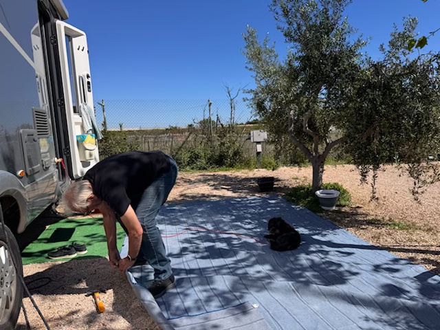 17. März, Dienstag. Die letzten Arbeiten gehen zügig voran. Das Küchenzelt ist abgebaut, der Vorzeltteppich ist als nächstes dran. Vier Monate lang war die Parzelle unser Vorgarten, unser Wohnzimmer und unser diplomatisches Hoheitsgebiet. Man sagt, man soll gehen, wenn es am schönsten ist. Nach vier Monaten sagen wir, man sollte gehen, bevor die Gemeinde Grundsteuer verlangt 😊. Ab Morgen heißt es: Adieu, fester Boden – hallo, Asphalt-Abenteuer
