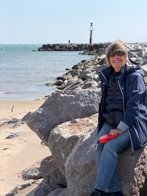 Uschi sitzt am Rande eines breiten Sandstrandes auf den Felsen, die als Wellenbrecher dienen. Der Wind pfeift mittlerweile so stark, dass sich das klassische „Paniermehl-Gefühl“ einstellt. Der Wind hat dermaßen kräftig aufgefrischt, dass der berüchtigte feine Sand gnadenlos in jede Pore der ungeschützten Teile des Körpers gewirbelt wird